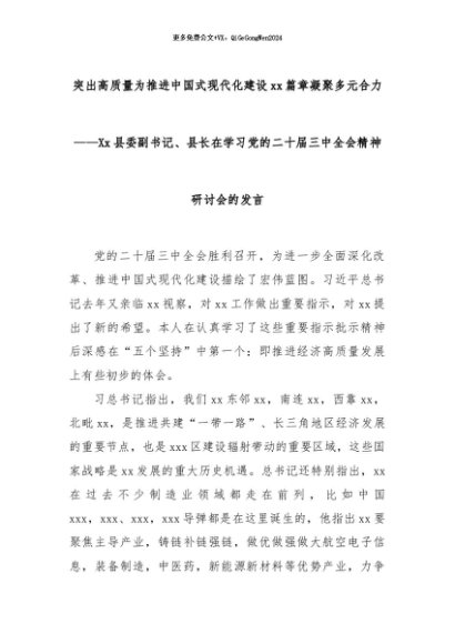 【七哥公文】2024年:突出高质量为推进中国式现代化建设xx篇章凝聚多元合力——Xx县委副书记、县长在学习党的二十届三中全会精神研讨会的发言+更多免费公文+VX:QiGeGongWen2024