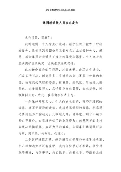 【七哥公文】2024年:集团新提拔人员表态发言+更多免费公文+VX:QiGeGongWen2024