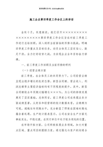 / 【七哥公文】2024年:施工企业第四季度工作会议上的讲话+更多免费公文+VX:QiGeGongWen2024