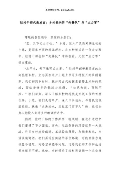 【七哥公文】2024年:驻村干部代表发言:乡村振兴的“先锋队”与“主力军”+更多免费公文+VX:QiGeGongWen2024