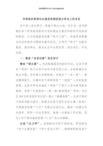 / 【七哥公文】2024年:市委组织部部长在基层党建经验分享会上的发言+更多免费公文+VX:QiGeGongWen2024