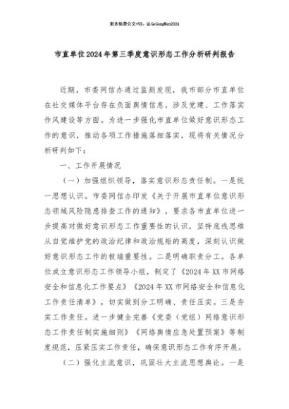【七哥公文】2024年:市直单位2024年第三季度意识形态工作分析研判报告+更多免费公文+VX:QiGeGongWen2024