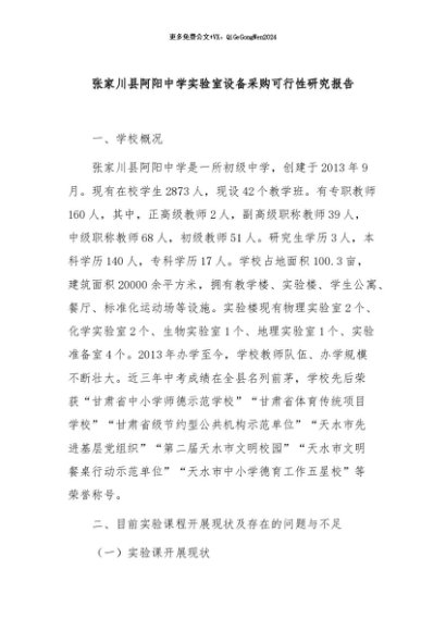 / 【七哥公文】2024年:张家川县阿阳中学实验室设备采购可行性研究报告+更多免费公文+VX:QiGeGongWen2024
