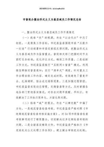 / 【七哥公文】2024年:市督效办整治形式主义为基层减负工作情况总结+更多免费公文+VX:QiGeGongWen2024