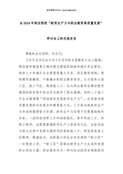 【七哥公文】2024年:在2024年职业院校“新质生产力与职业教育高质量发展”研讨会上的交流发言+更多免费公文+VX:QiGeGongWen2024