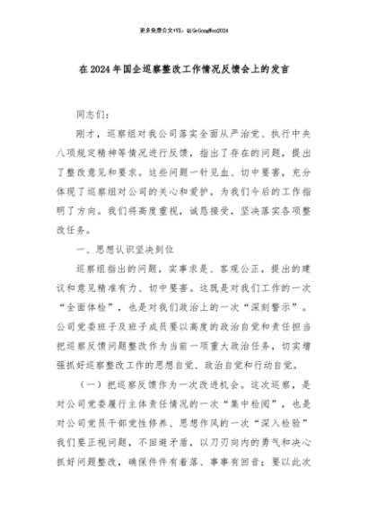 / 【七哥公文】2024年:在2024年国企巡察整改工作情况反馈会上的发言+更多免费公文+VX:QiGeGongWen2024