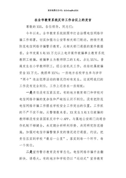 / 【七哥公文】2024年:在全市教育系统反诈工作会议上的发言+更多免费公文+VX:QiGeGongWen2024