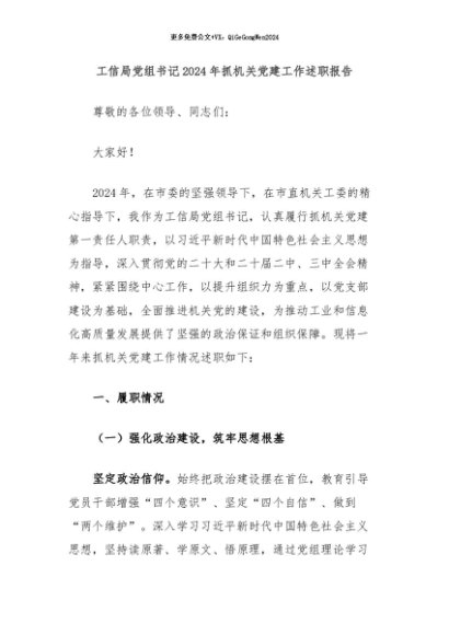 / 【七哥公文】2024年:工信局党组书记2024年抓机关党建工作述职报告+更多免费公文+VX:QiGeGongWen2024