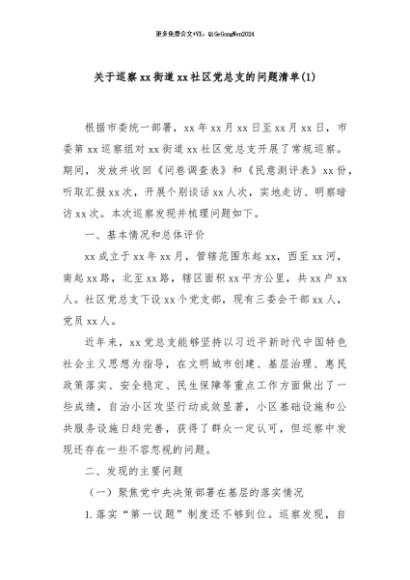 / 【七哥公文】2024年:关于巡察xx街道xx社区党总支的问题清单(1)+更多免费公文+VX:QiGeGongWen2024