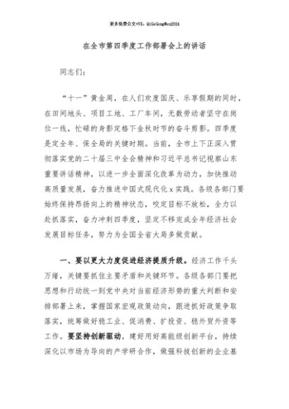 / 【七哥公文】2024年:在全市第四季度工作部署会上的讲话+更多免费公文+VX:QiGeGongWen2024