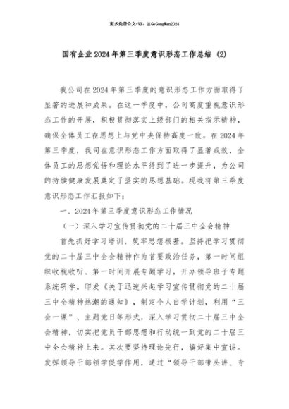 【七哥公文】2024年:国有企业2024年第三季度意识形态工作总结 (2)+更多免费公文+VX:QiGeGongWen2024