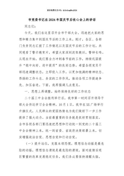 / 【七哥公文】2024年:市党委书记在2024年国庆节后收心会上的讲话+更多免费公文+VX:QiGeGongWen2024