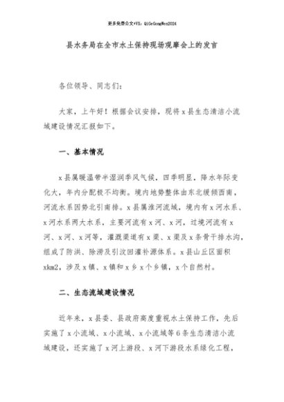 / 【七哥公文】2024年:县水务局在全市水土保持现场观摩会上的发言+更多免费公文+VX:QiGeGongWen2024