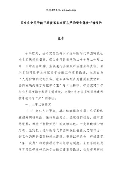 【七哥公文】2024年:国有企业关于前三季度落实全面从严治党主体责任情况的报告+更多免费公文+VX:QiGeGongWen2024
