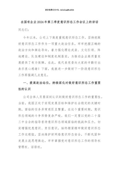 【七哥公文】2024年:在国有企业2024年第三季度意识形态工作会议上的讲话+更多免费公文+VX:QiGeGongWen2024