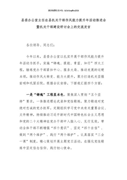 【七哥公文】2024年:县委办公室主任在县机关干部作风能力提升年活动推进会暨机关干部建设研讨会上的交流发言+更多免费公文+VX:QiGeGongWen2024