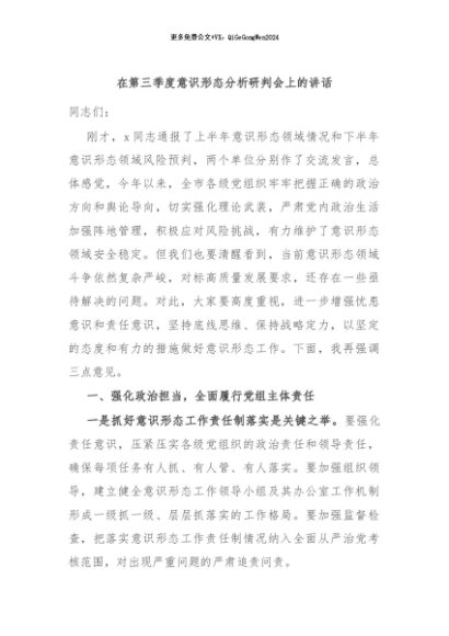 / 【七哥公文】2024年:在第三季度意识形态分析研判会上的讲话+更多免费公文+VX:QiGeGongWen2024