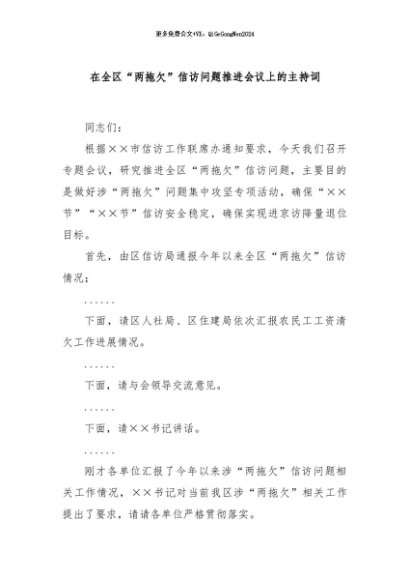 / 【七哥公文】2024年:在全区“两拖欠”信访问题推进会议上的主持词+更多免费公文+VX:QiGeGongWen2024