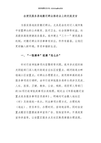 / 【七哥公文】2024年:在便民服务易地搬迁群众推进会上的交流发言+更多免费公文+VX:QiGeGongWen2024