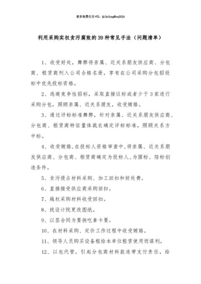 / 【七哥公文】2024年:利用采购实权贪污腐败的39种常见手法(问题清单)+更多免费公文+VX:QiGeGongWen2024