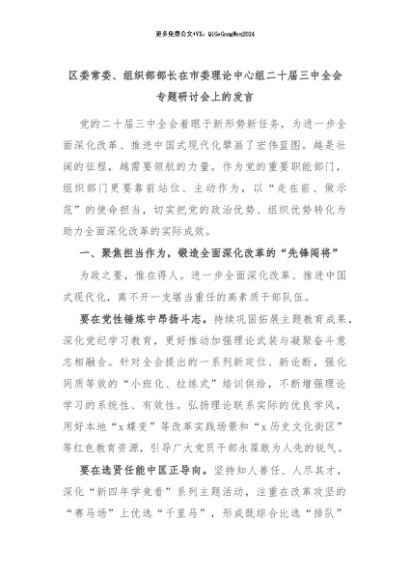 【七哥公文】2024年:区委常委、组织部部长在市委理论中心组二十届三中全会专题研讨会上的发言+更多免费公文+VX:QiGeGongWen2024
