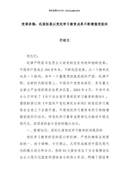 【七哥公文】2024年:党课讲稿:巩固拓展以党纪学习教育成果不断增强党组织行动力+更多免费公文+VX:QiGeGongWen2024
