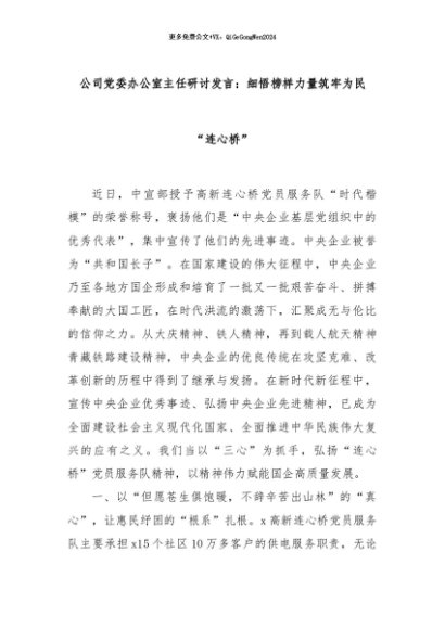 【七哥公文】2024年:公司党委办公室主任研讨发言:细悟榜样力量筑牢为民“连心桥”+更多免费公文+VX:QiGeGongWen2024