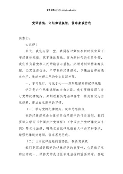 / 【七哥公文】2024年:党课讲稿:守纪律讲规矩,筑牢廉政防线+更多免费公文+VX:QiGeGongWen2024