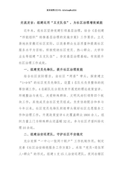 【七哥公文】2024年:交流发言:组建运用“五支队伍”,为社区治理增效赋能+更多免费公文+VX:QiGeGongWen2024