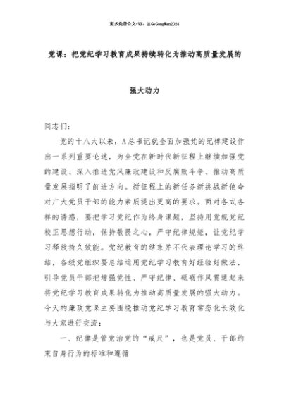 【七哥公文】2024年:党课:把党纪学习教育成果持续转化为推动高质量发展的强大动力+更多免费公文+VX:QiGeGongWen2024