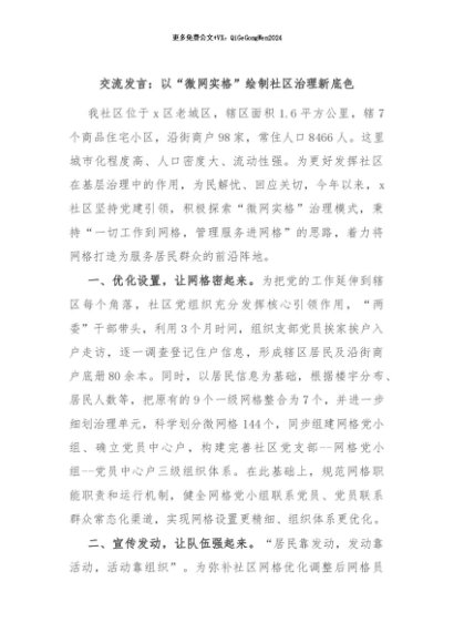 / 【七哥公文】2024年:交流发言:以“微网实格”绘制社区治理新底色+更多免费公文+VX:QiGeGongWen2024