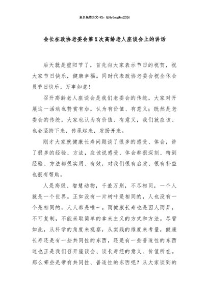 / 【七哥公文】2024年:会长在政协老委会第X次高龄老人座谈会上的讲话+更多免费公文+VX:QiGeGongWen2024
