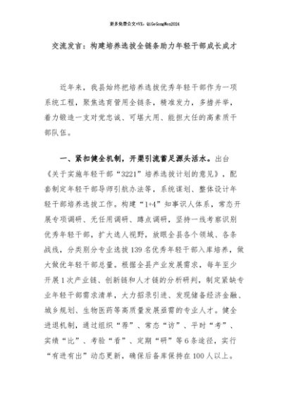 / 【七哥公文】2024年:交流发言:构建培养选拔全链条助力年轻干部成长成才+更多免费公文+VX:QiGeGongWen2024