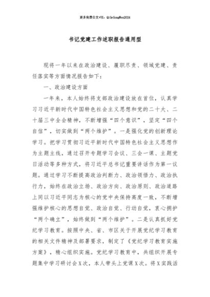 / 【七哥公文】2024年:书记党建工作述职报告通用型+更多免费公文+VX:QiGeGongWen2024