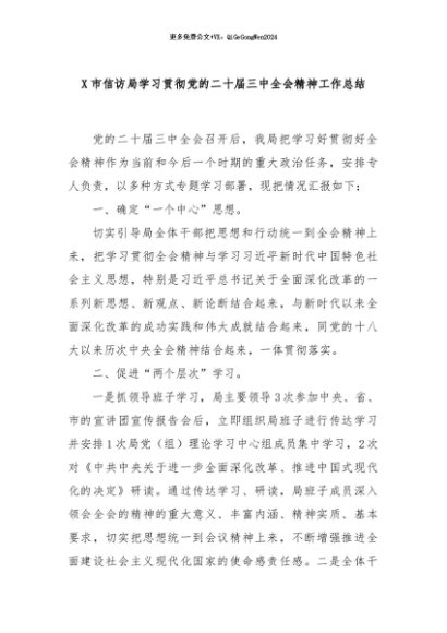 / 【七哥公文】2024年:X市信访局学习贯彻党的二十届三中全会精神工作总结+更多免费公文+VX:QiGeGongWen2024