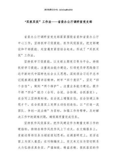 【七哥公文】2024年:“双抓双促”工作法——省委办公厅调研室党支部+更多免费公文+VX:QiGeGongWen2024