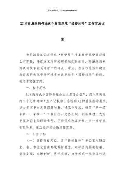 【七哥公文】2024年:XX市政府采购领域优化营商环境“揭榜挂帅”工作实施方案+更多免费公文+VX:QiGeGongWen2024