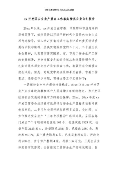 / 【七哥公文】2024年:xx开发区安全生产重点工作落实情况自查自纠报告+更多免费公文+VX:QiGeGongWen2024