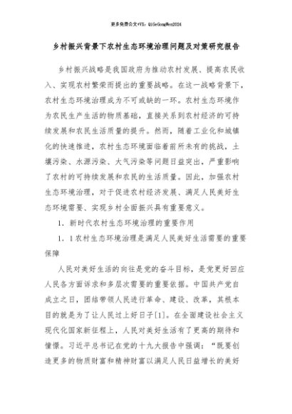 / 【七哥公文】2024年:乡村振兴背景下农村生态环境治理问题及对策研究报告+更多免费公文+VX:QiGeGongWen2024