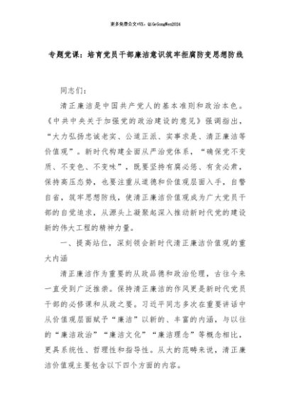 【七哥公文】2024年:专题党课:培育党员干部廉洁意识筑牢拒腐防变思想防线+更多免费公文+VX:QiGeGongWen2024