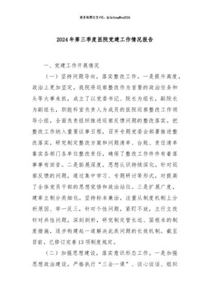 / 【七哥公文】2024年:2024年第三季度医院党建工作情况报告+更多免费公文+VX:QiGeGongWen2024