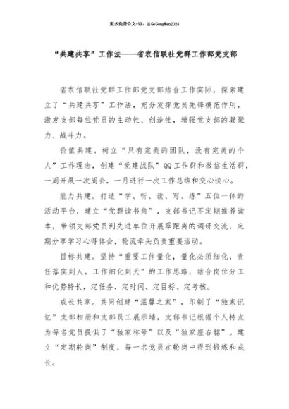 / 【七哥公文】2024年:“共建共享”工作法——省农信联社党群工作部党支部+更多免费公文+VX:QiGeGongWen2024