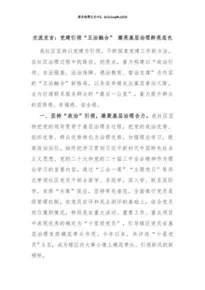【七哥公文】2024年:交流发言:党建引领“五治融合” 擦亮基层治理鲜亮底色+更多免费公文+VX:QiGeGongWen2024