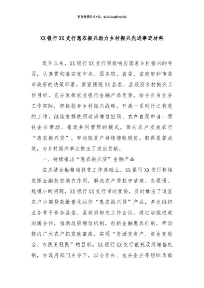 / 【七哥公文】2024年:XX银行XX支行惠农振兴助力乡村振兴先进事迹材料+更多免费公文+VX:QiGeGongWen2024