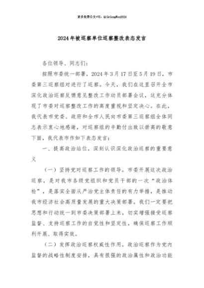 / 【七哥公文】2024年:2024年被巡察单位巡察整改表态发言+更多免费公文+VX:QiGeGongWen2024