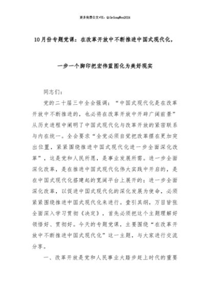 【七哥公文】2024年:10月份专题党课:在改革开放中不断推进中国式现代化,一步一个脚印把宏伟蓝图化为美好现实+更多免费公文+VX:QiGeGongWen2024