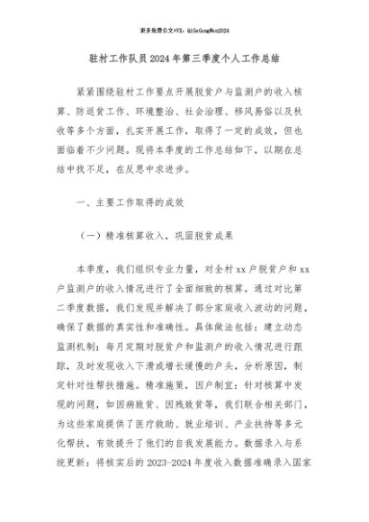 / 【七哥公文】2024年:驻村工作队员2024年第三季度个人工作总结+更多免费公文+VX:QiGeGongWen2024