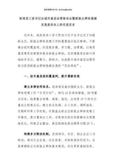 【七哥公文】2024年:街道党工委书记在城市基层治理推进会暨新就业群体稳健发展座谈会上的交流发言+更多免费公文+VX:QiGeGongWen2024