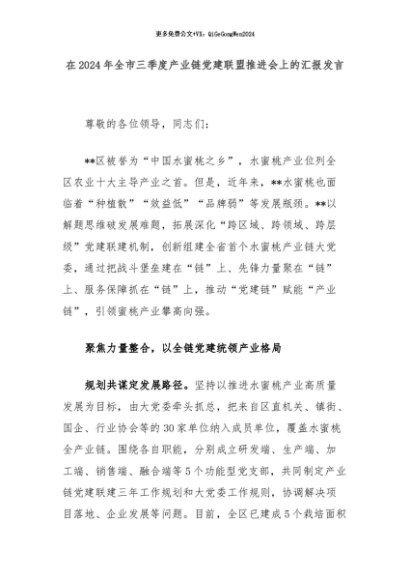 【七哥公文】2024年:在2024年全市三季度产业链党建联盟推进会上的汇报发言+更多免费公文+VX:QiGeGongWen2024