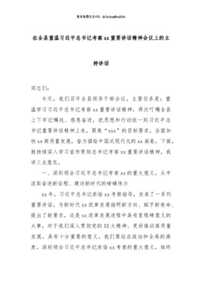【七哥公文】2024年:在全县重温习总书记考察xx重要讲话精神会议上的主持讲话+更多免费公文+VX:QiGeGongWen2024